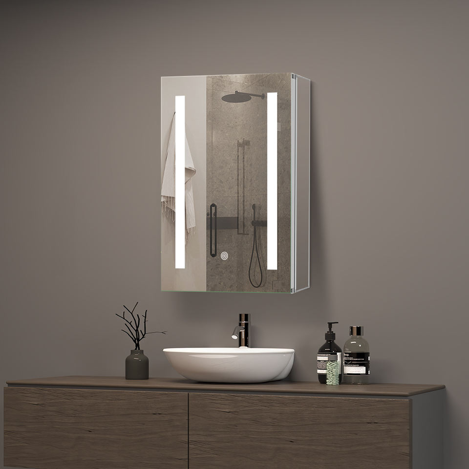 The Prominence 2–Bar Mirrored Cabinet gives you either a Top/Bottom or Left/Right design aesthetic with an offset illumination 2 inches from the mirror’s edge as well as the option of straight edge or rounded corners. Inside you will find adjustable glass shelves, and a mirror on reverse side of the door for ease of use when the cabinet is open. With our optional simple one-touch dimming system you can not only set your preferred light level, but you have the flexibility of changing the color temperature from a cool 5,000K task lighting option to a warm, sunny 3,000K ambient glow. As an added bonus, all mirrors can be upgraded with an integrated night light, Bluetooth speaker, built in interior outlets, an interior LED light, and soft-closed hinges giving you even more user-friendly options.