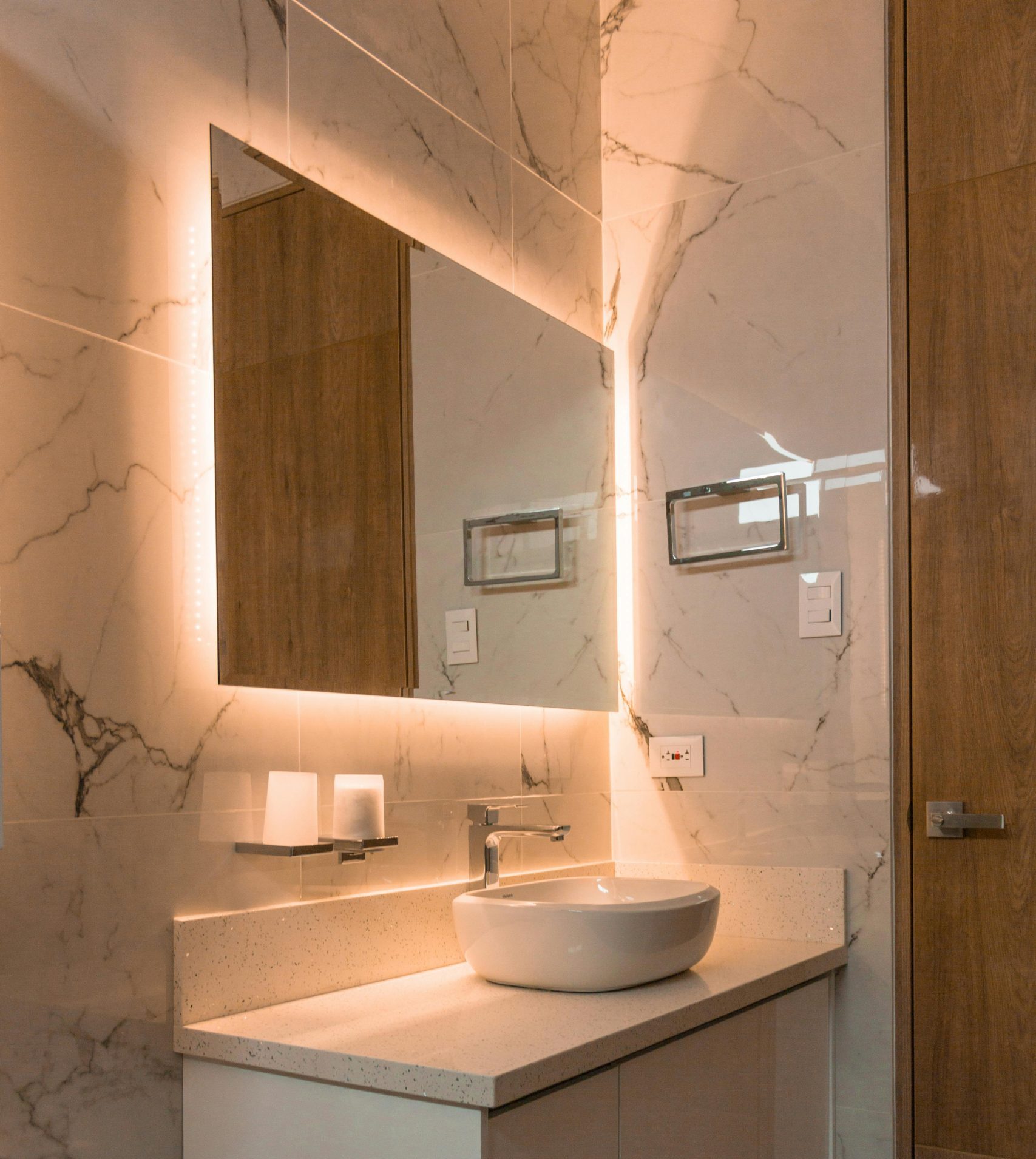 The Wall Glow Series offers you a full backlit illumination around the entire border of the mirror as well as the option of a sleek square edge or rounded corners. Available in a fully customizable rectangular or square silhouette. The optional one-touch dimming system allows you to choose the perfect light intensity and color temperature—from a cool 5,000K task lighting to a warm, sunlit 2,700K glow. Elevate your experience even further with upgrades like an integrated night light, a built-in Bluetooth speaker, and other user-friendly features that transform your mirror into a personalized statement of style and function.